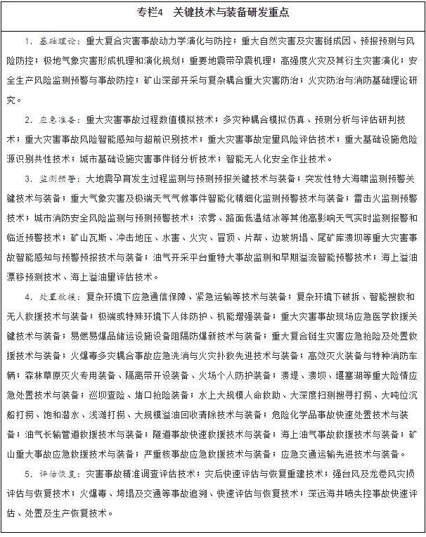 建设重大自然灾害风险综合防范、重特大生产安全事故防控、复合链生灾害事故防治、城市安全与应急、矿山重大灾害治理、防汛抗旱应急技术、应急医学救援等国家级实验室和部级实验室。建设地震科学实验场和地震动力学国家重点实验室。实施大灾巨灾情景构建工程。建设火灾防治、消防救援装备、防汛抗旱和气象灾害防治、应急救援机器人检测、无人机实战验证、应急通信和应急装备物联网、大型石油储罐火灾抢险救援、城市跨类灾害事故防控、煤矿深部开采与冲击地压防治、高瓦斯及突出煤矿灾害防治等研究基地。依托现有机构完善危险化学品安全研究支撑平台。优化自然灾害领域国家野外科学观测研究站布局。建设应急管理领域国家科技资源共享服务平台和重点灾害地区综合防灾减灾技术支撑平台。完善区域地球表层、巨灾孕育发生机理等模拟系统和国际灾害信息管理平台。