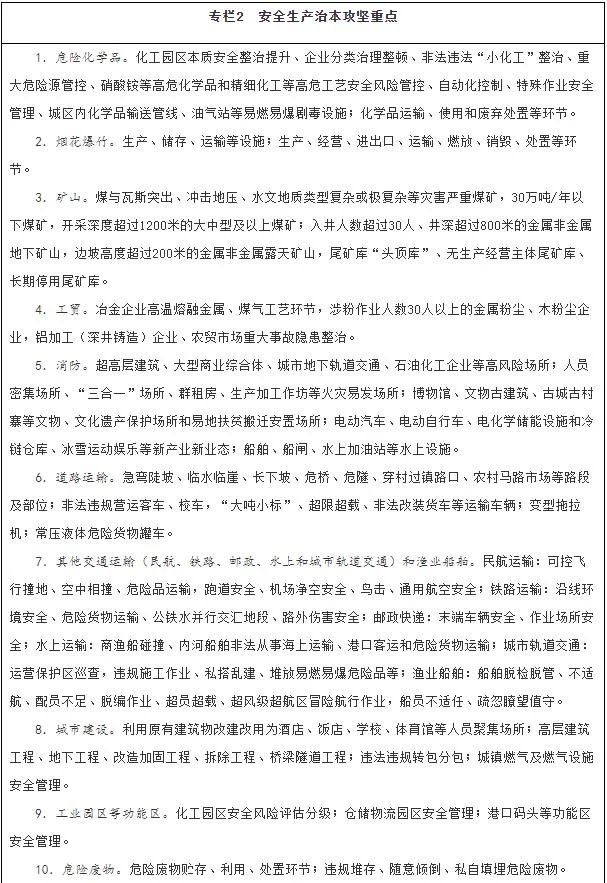 实施化工园区安全提质和危险化学品企业安全改造工程,以危险工艺本质安全提升与自动化改造、安全防护距离达标改造、危险源监测预警系统建设为重点,推进化工园区示范创建,建设化工园区风险评估与分级管控平台。推进城镇人口密集区危险化学品生产企业搬迁改造。开展煤矿瓦斯综合治理和水害、火灾、冲击地压等重大灾害治理。基本完成尾矿库“头顶库”安全治理及无生产经营主体尾矿库、长期停用尾矿库闭库治理。实施“工业互联网+安全生产”融合应用工程,建设行业分中心和数据支撑平台,建立安全生产数据目录。