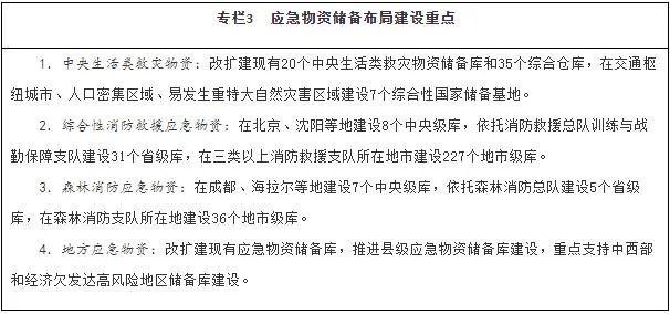 充分利用仓储资源,依托现有中央和地方物资储备库,建设综合应急物资储备库。在交通枢纽城市、人口密集区域、易发生重特大自然灾害区域建设一批综合性国家储备基地。建设完善国家综合性消防救援队伍应急物资储备库及战勤保障站。在关键物流枢纽建设应急物资调运平台和区域配送中心,依托大型快递物流企业建设一批综合应急物资物流基地。完善国家应急资源管理平台和应急物资保障数据库,汇聚应急物资信息。