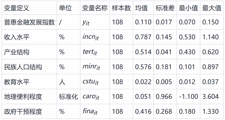 其中,被解释变量yit表示民族地区i在年份t的普惠金融发展指数。核心解释变量包括:居民人均可支配收入与全国水平之比(incnit)、第三产业增加值与GDP之比(tertit)、少数民族人口与总人口之比(minrit)、每十万人口高等学校平均在校生数(cstuit)、私人汽车拥有量(caroit)、财政支出与GDP之比(finait)。μi为个体固定效应,用于控制不同地区间不随时间变化的潜在异质性,如地理区位、历史传统、制度环境等。εit为随机扰动项。