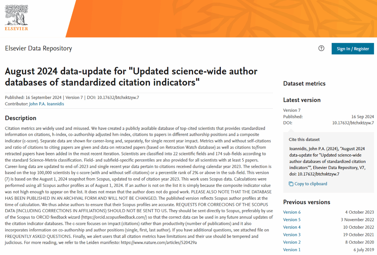 近日,美国斯坦福大学联合爱思唯尔数据库(Elsevier Data Repository)发布了“2024年度全球前2%顶尖科学家榜单”(Stanford University Top 2% Scientists List 2024)。该榜单通过统计全球近700万名科学家发表的论文数及引用次数,采用6种指标建模进行综合评分,遴选出全球217098人,大致涵盖各学科排名前2%的科学家。榜单提供了面向科学家长期进行科学研究表现的衡量指标,客观真实地反映出科学家的学术影响力,是全球范围内颇具影响力和公信力的实力榜单。
