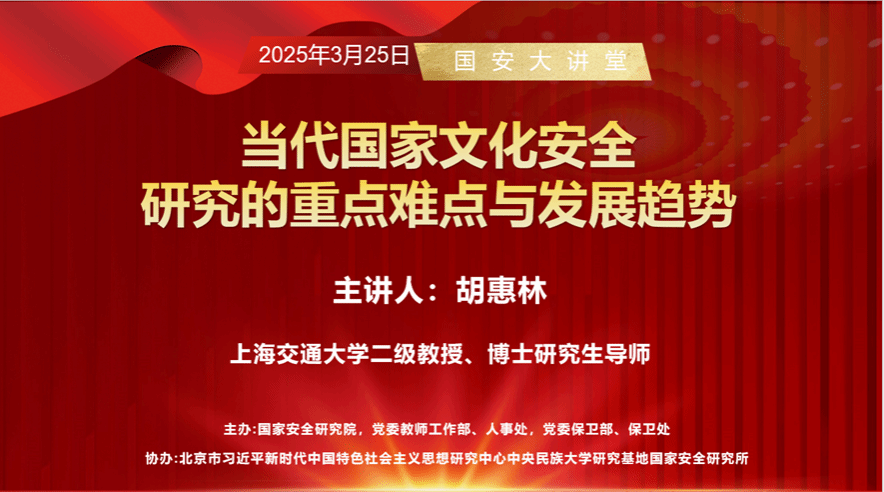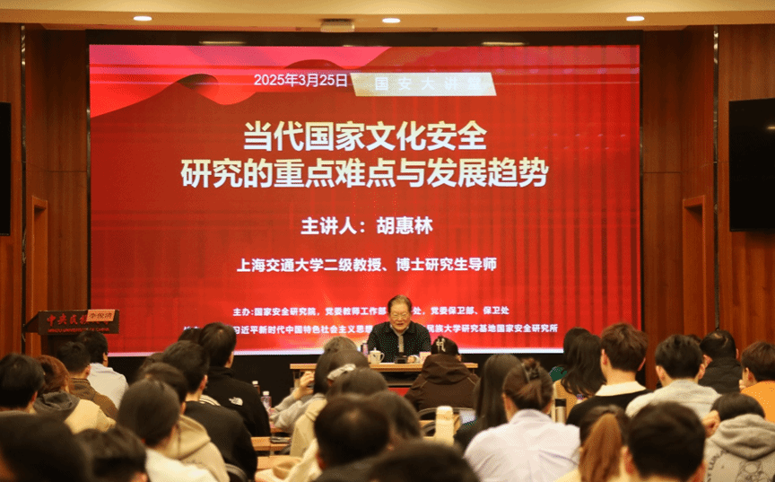 今年是《中华人民共和国国家安全法》颁布施行10周年,在第10个全民国家安全教育日即将到来之际,为深入贯彻落实习近平总书记总体国家安全观,增强广大师生的国家安全意识,3月25日晚,四人麻将玩法 举办了2025年“国安大讲堂”第一讲。特邀上海交通大学二级教授、博士研究生导师胡惠林教授在海淀校区知行堂作题为“当代国家文化安全研究的重点难点与发展趋势”的专题讲座。