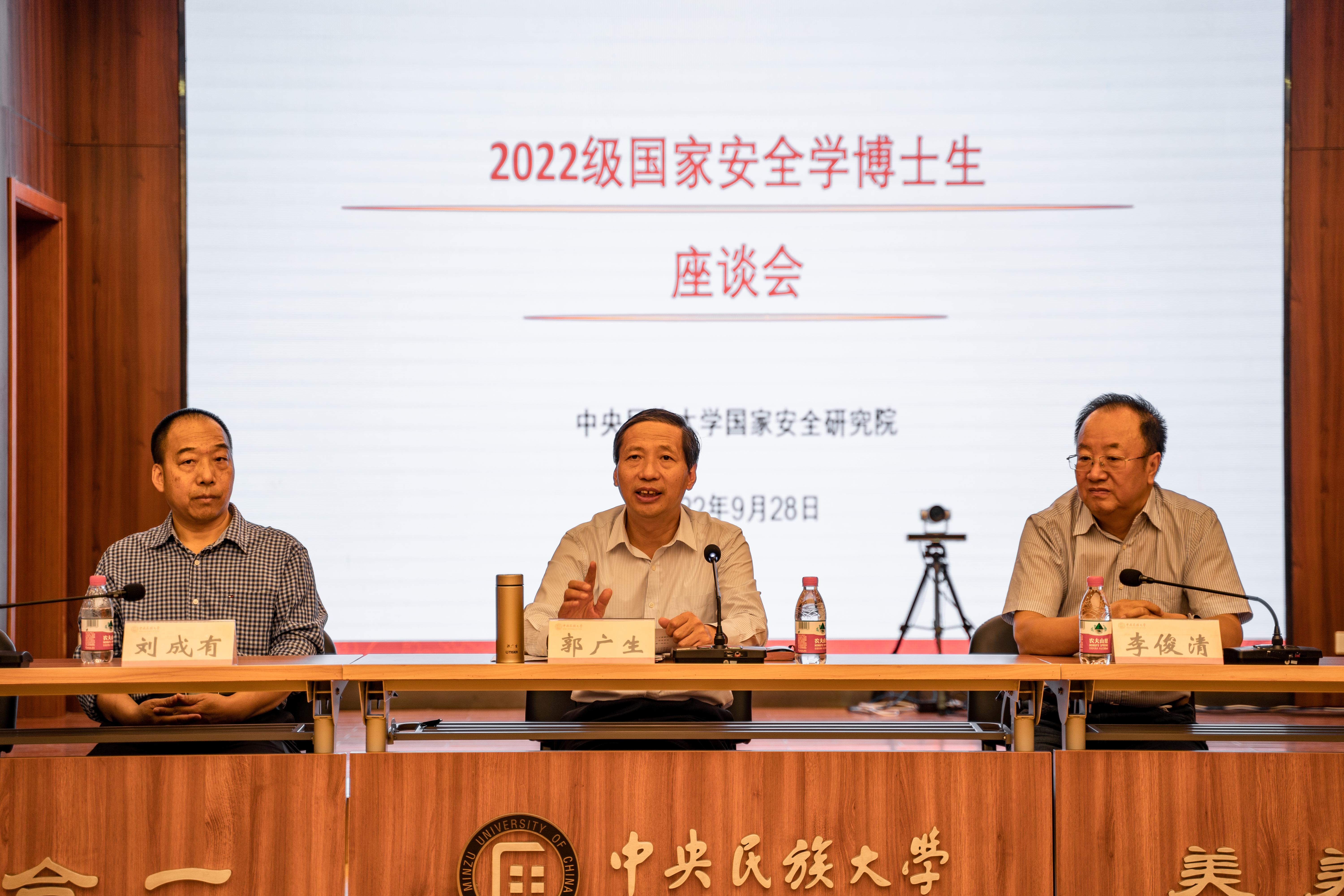 郭广生对2022级博士生表示热烈地欢迎和祝贺。他指出,国家安全学是一门新兴交叉学科,具有跨学科、综合性强的特点,是理工文管等学科的交叉融合。学校国家安全学建设,始终以服务国家战略和民族团结进步事业为宗旨,聚焦全球治理、边疆安全、文化安全、语言信息安全、应急管理、生态安全和人权保障等领域,开展高质量学术研究。他希望同学们要注重构建多学科知识体系,使用好多种学术身份,开展多维度学习,在学习与实践中明确目标和任务。他强调,要强化政治意识,锤炼政治意志和政治品格。要树立远大理想,始终心怀“国之大者”,沉下心多读书、多调研、多思考,形成自己的知识体系。要建立健全沟通机制,定期组织学术活动,开阔学术视野,提升研究水平,学有所成,为中华民族伟大复兴贡献自己的力量。