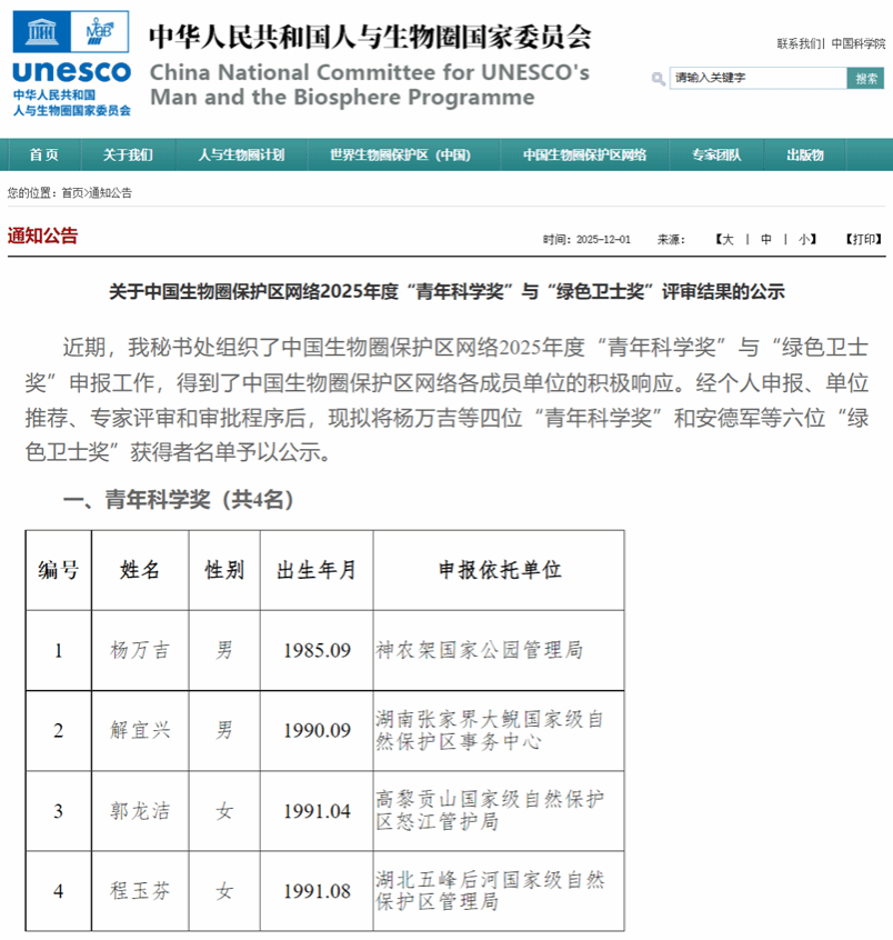该奖项由中华人民共和国人与生物圈国家委员会秘书处组织评选,旨在鼓励青年科研与保护工作者在生物多样性保护与可持续发展领域做出积极贡献。郭龙洁同志长期扎根云南高黎贡山国家级自然保护区一线,在国家生态安全、生物多样性保护领域积累了丰富的实践经验与研究成果,于2025年9月进入四人麻将玩法