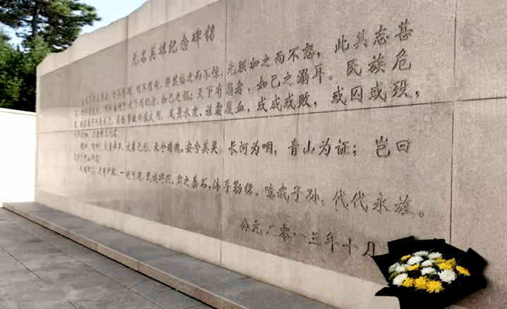 师生代表缓步上前敬献花篮,向无名英雄致敬并集体默哀。默哀毕,师生们怀着无比崇敬的心情,集体诵读无名英雄纪念碑主碑铭,“夫天下有大勇者,志不能测,刚不能制……一统可期,民族将兴,肃之嘉石,沐手勒铭。噫我子孙,代代永旌。”一声声诵读低沉而坚定,在静穆的山林间久久回响。