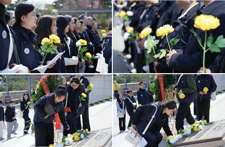 诵读结束后,全体师生依次将手中菊花轻轻献于碑前,寄托对英烈的缅怀与敬意。纪念仪式最后,学生党员代表庄严展开党旗,全体师生在党旗前合影留念。